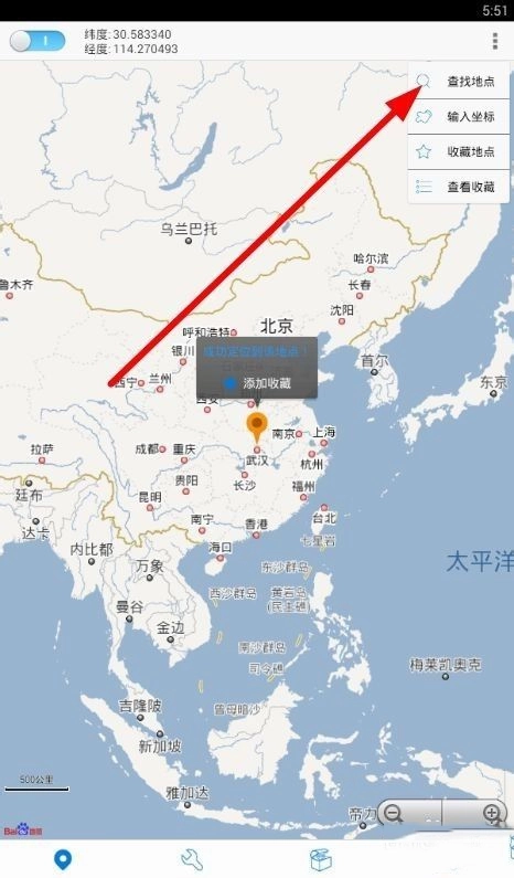 3、进入小菜单界面,包括查找地点、输入坐标、收藏地点和查看收藏,