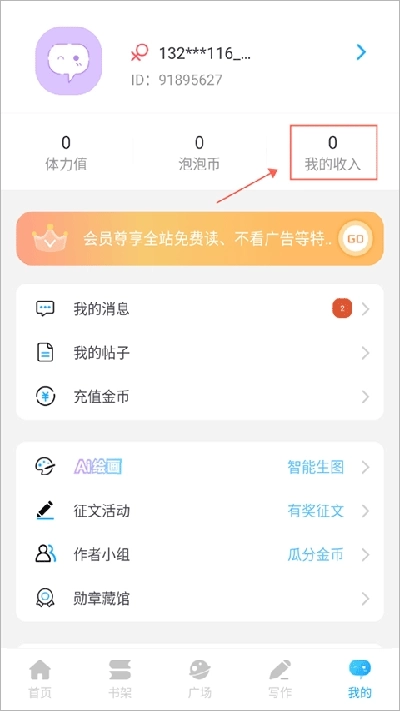 1、首先打开话本小说app,进入我的页面,点击“我的收入”;