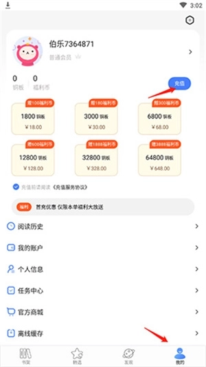 1、打开软件,点击底端的“我的”选项,然后点击“充值”选项。