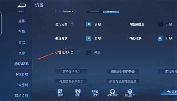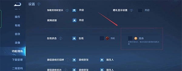 3、在功能/隐私选项中,向下滑动页面,找到在线状态设置。这里有在线、勿扰、隐身三种模式,玩家只需选择隐身模式即可。