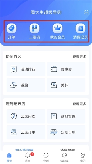 1、使用账号密码登录后,在首页可以进行开单、查看会员及消费记录多项操作。