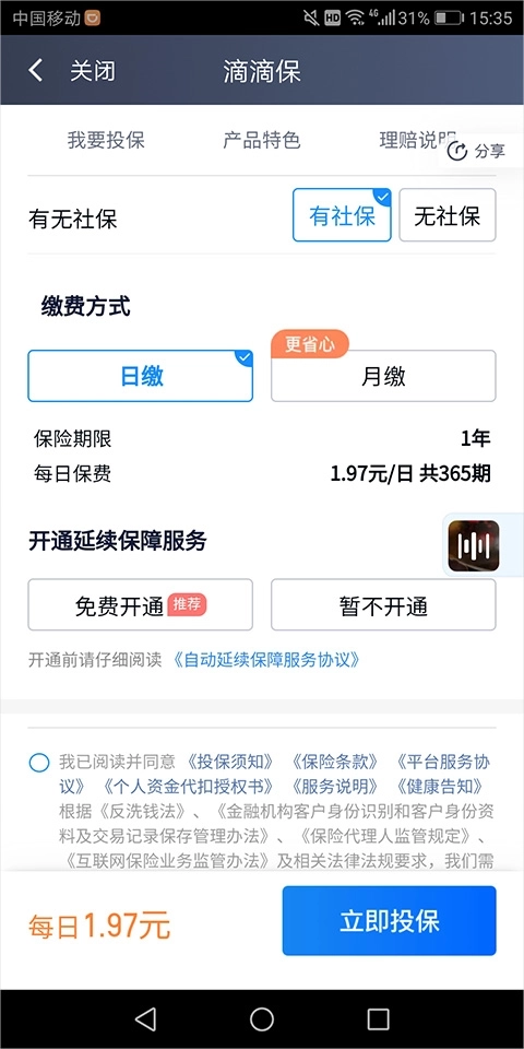 5、并免费开通续保服务,以及勾选同意相关条款须知后点击【立即投保】