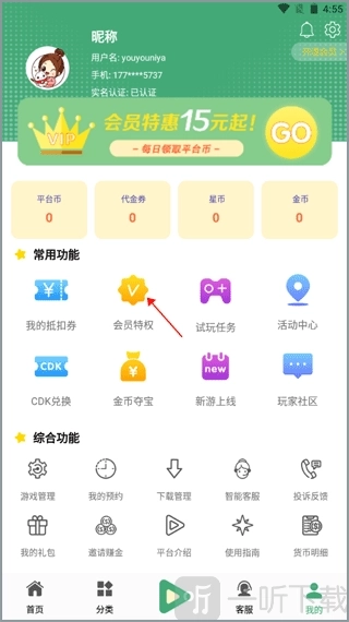2、在个人中心里有很多个功能可以使用,选择常用功能的“会员特权”。