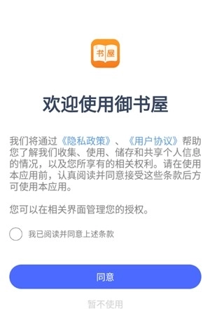 1、第一步,前往开心电玩软件园下载并安装“御书屋”。初次打开软件进入界面时,需阅读对应的隐私协议,若认为无问题,点击同意即可开始使用。