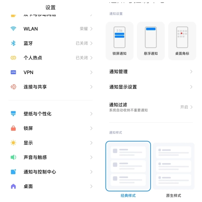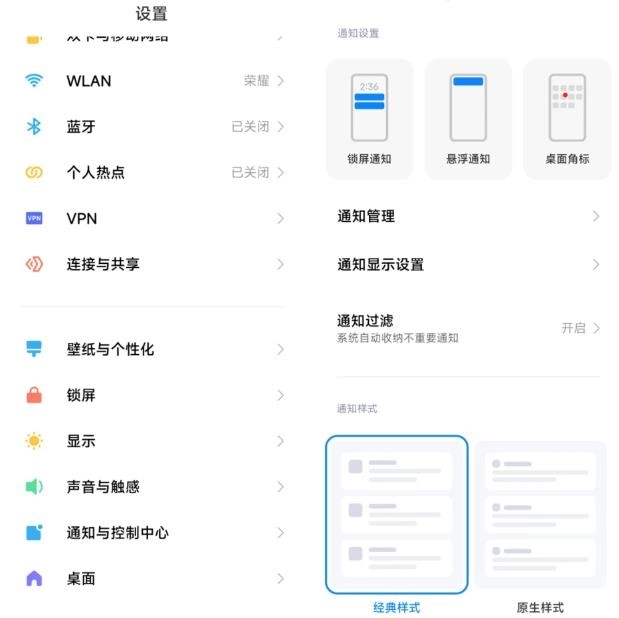 1.进入【通知与控制中心】-【通知显示设置】,切换为原生样式,方便后续操作