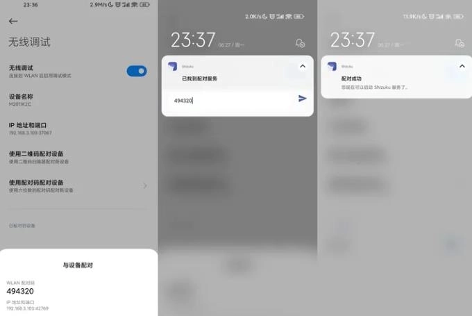 4. 届时会显示配对成功,接着返回Shizuku,选择无线调试中的启动选项,成功启动后,主页便会显示Shizuku正在运行。