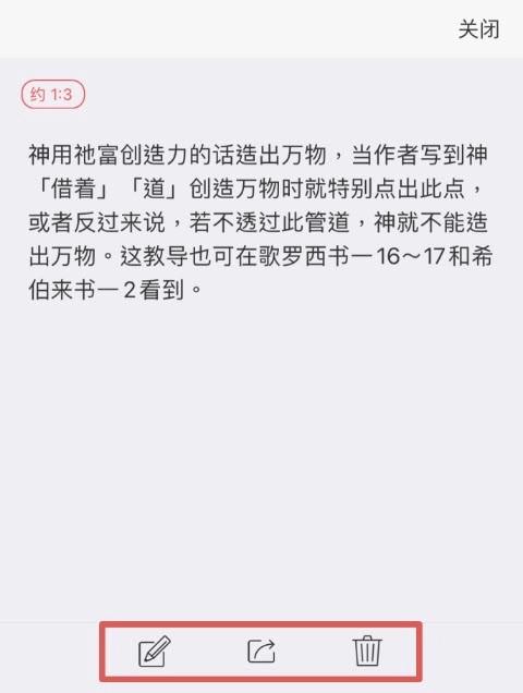 笔记保存后,经文右侧会显示正方形黄色标记。点击该图标可以查看、修改、分享和删除笔记。