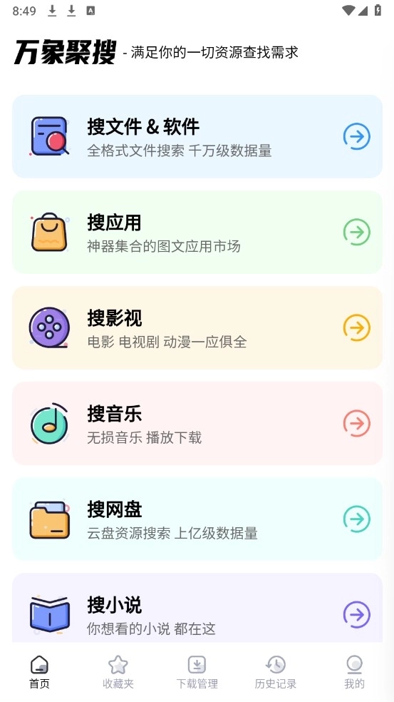 万象聚搜最新版本,是一款备受青睐的资源搜索利器。该软件的UI界面设计简约,体积轻盈,搭载强大的搜索引擎。借助它,用户只需输入关键词,就能搜索到文件、游戏、小说、漫画、影视等各类资源。不仅如此,软件还支持用户进行收藏与下载操作,便于后续管理。值得一提的是,软件内的资源均经过严格测试,不存在任何病毒干扰,也没有广告的烦扰,为用户提供优质的服务体验。