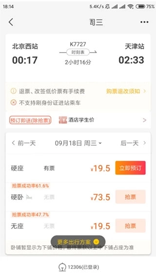 4、不仅如此,最为人性化之处在于“上车补票”功能,它能够自动检索出可靠的出行计划。从此无需再为了多坐一会儿,而费劲地去查询路线上每个站点的余票情况。