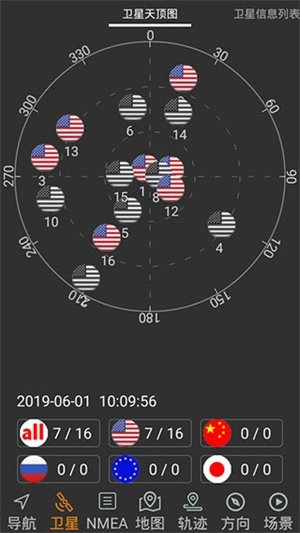 7、直观显示当前卫星信号接收状态,支持北斗、GPS、GLONASS、伽利略等多个卫星导航系统。