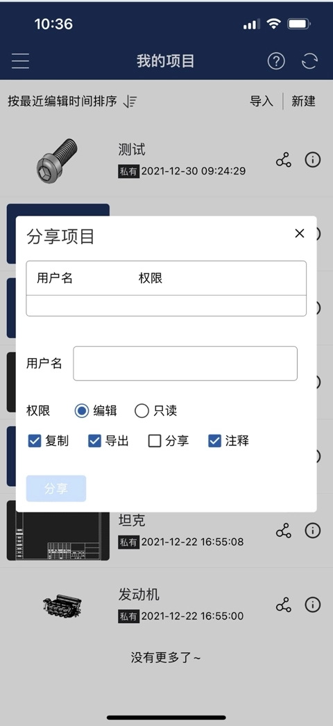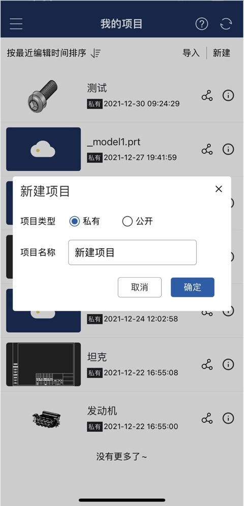 3、新建操作:点击“新建”按钮,手机底部会弹出新建菜单,在此菜单中,你能够选择新建项目或者文件夹。当选择新建项目时,可进一步选择项目类型为私有或公开。值得注意的是,新建项目时,系统默认会自动创建一个空的零件与装配文档。