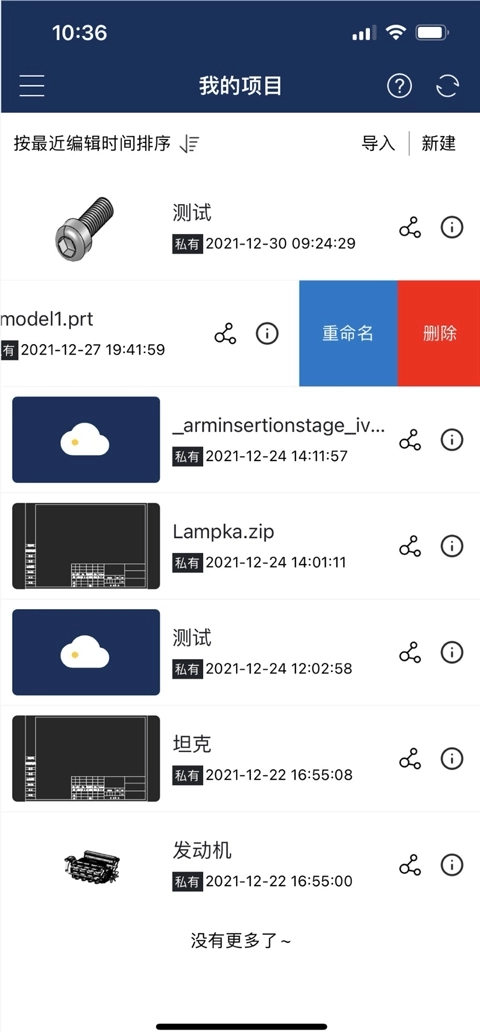 2、导入操作: 点击“导入”按钮,系统将显示当日剩余可用的导入次数。随后,您可在手机文件中挑选支持的模型格式,选中后即开始导入流程。 支持的模型格式如下:IGES、STEP、PTC、NX、CATIA、SolidWorks、ParaSolid、OBJ、STL、IFC、3DM、Revit、PDF、DWG 。 特别说明:于项目管理界面导入的文档,系统会自动创建一个项目,并在该项目中展示导入的文档。