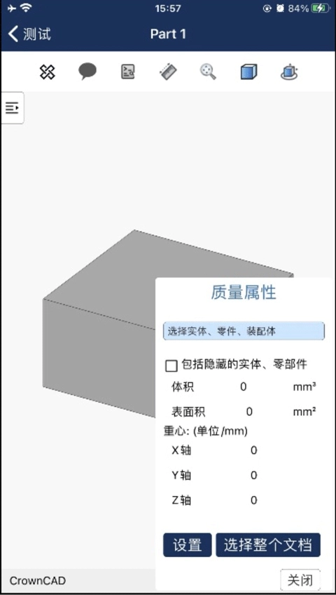 体积、表面积、重心:所选实体的体积、表面积、重心,不包括曲面。