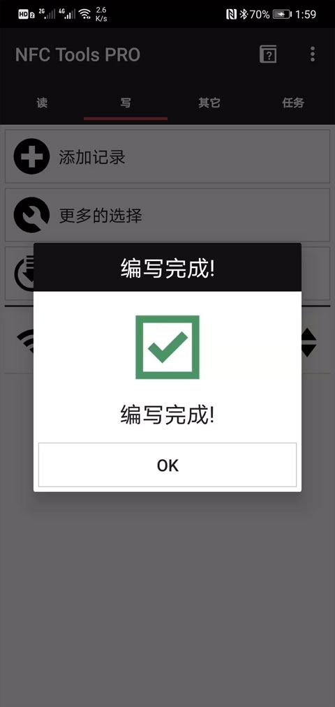 1首先,开启手机的NFC功能。接着,打开刚刚下载好的NFC Tools PRO应用程序。随后,切换至“写”的操作界面,再点击“添加记录”选项。