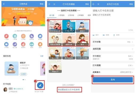 开启app,进入“习惯养成”应用界面,轻点应用首页右下角的“铅笔”图标,可挑选合适的打卡任务模板,也能自定义打卡任务。接着设置具体的打卡内容,像打卡对象、打卡频次、打卡周期等,全部设置好后,点击“发布”按钮就完成了。