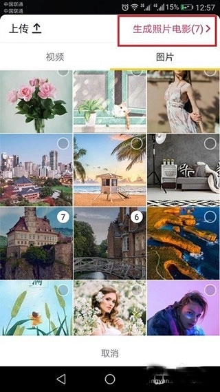 4、第四步,挑选用于生成视频的图片,接着点击右上方的“生成照片电影”。这里要留意,所选照片数量需大于1张,具体可参考下图: