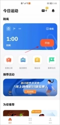 2、进入之后,可以看到首页最醒目的功能就是跳绳,我们首先体验跳绳功能,点击“开始”会直接进入默认一分钟计数跳绳页,点击蓝色内容可进入跳绳设置界面。