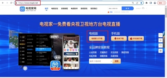 在电脑上打开电视家网(网址为www.tvapk.net ),点击“电视家3.0下载”,将电视家3.0安装包下载至U盘中。