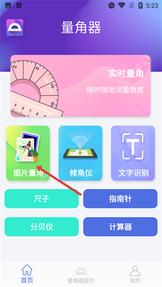 打开【量角器】的首页后,找到并点击【图片量角】功能选项,即可进入对应的图片量角操作界面,在该界面中能够对图片开展角度测量工作。