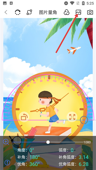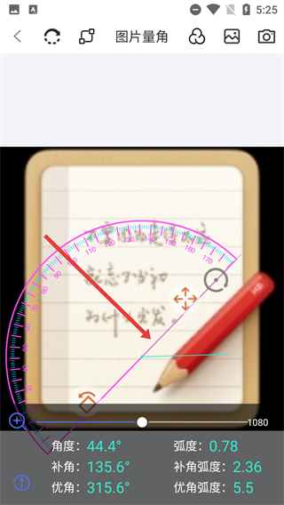 在测量界面中,通过调整量角器的摆放位置,能够查看【角度】【弧度】等相关数据,从而实现对图片角度的测量操作。