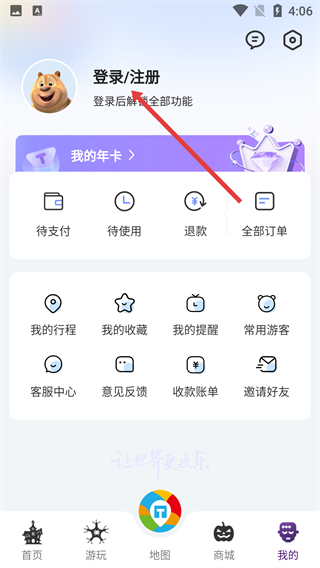 在个人页面中找到【登录/注册】按钮并点击,即可进入登录界面。