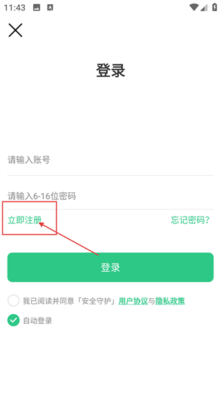 选择【账号登录】后,若您还没有注册账号,可点击【立即注册】进入注册流程,注册前需要先勾选同意相关协议。